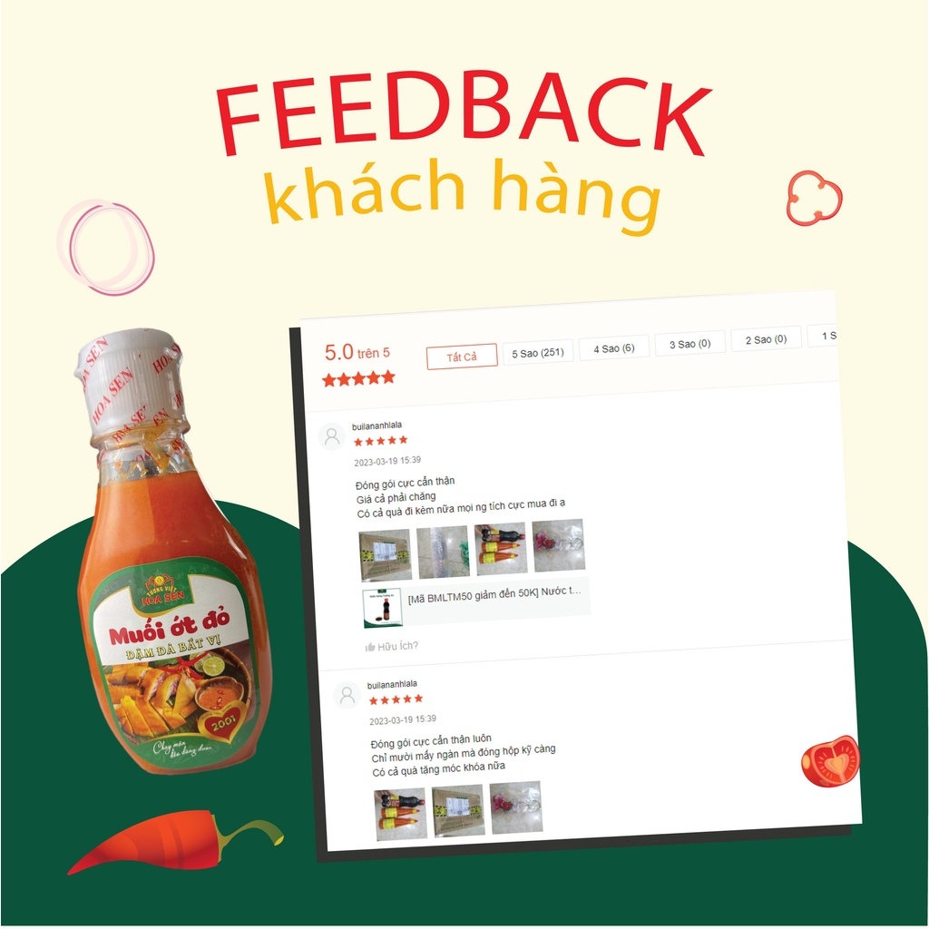 Muối ớt đỏ Tương Việt Hoa Sen, dùng chấm hải sản, đồ nướng Thành phần muối ớt đỏ: Đường, nước cốt chanh tươi , ớt, muối, nước, tắt, chất điều vị,…. Thông tin lưu ý của muối ớt đỏ: Sản phẩm làm từ ớt tươi tự nhiên nên màu sắc có thể thay đổi nhưng không ảnh hưởng đến chất lượng sản phẩm HƯỚNG DẪN SỬ DỤNG muối ớt đỏ: Dùng để chấm hải sản, gà luộc, các món nướng, hấp và rau củ, các món chiên quay khác Hướng dẫn bảo quản Bảo quản nơi khô ráo, thoaáng mát, tránh xa ánh nắng trực tiếp đậy kín nắp sau khi sử dụng Hsd: 12 tháng kể từ ngày sản xuất KLT: 185g #muoiot #muoiotchamhaisan #tuongviethoasen #muoiotxanh #muoiotdo