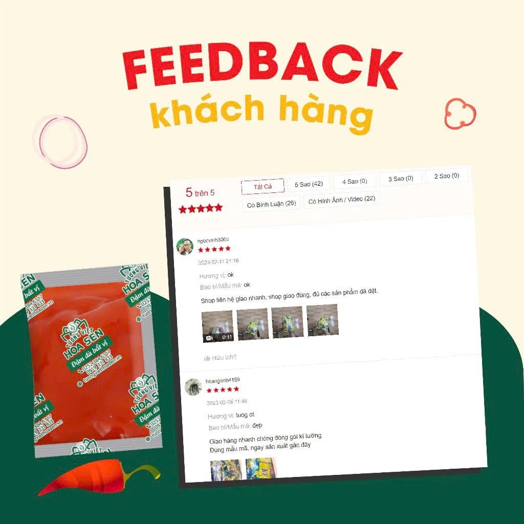 Thùng Tương ớt gói nhỏ 15g TV - Thùng 6 Túi 600 gói - Tương Việt Hoa Sen Tương ớt là món ăn kèm hấp dẫn, điển hình là khi ăn với 1 số món nước, món ăn vặt sẽ giúp món ăn bùng vị ngon. Đối với những người yêu thích vị cay, tương ớt cay ngon là một gia vị không thể thiếu trên bàn ăn. Hãy cùng Tương Việt Hoa Sen tìm hiểu ngay về loại Tương ớt màng gói nhỏ 15g này nhé! Giới thiệu về Tương ớt gói nhỏ 15g TV: Tương ớt gói nhỏ 15g TV giúp món ăn đậm đà, kích thích vị giác với vị cay hấp dẫn. Làm từ nguyên liệu an toàn, dùng để chấm, nêm nếm, tẩm ướp. Túi 100 gói phù hợp cho quán ăn, giúp kiểm soát lượng dùng, giảm lãng phí, tiết kiệm chi phí. Ưu điểm nổi bật của sản phẩm Tương ớt gói nhỏ 15g TV: Màu đỏ tự nhiên từ ớt, mịn màng, thơm dịu, cay tê hấp dẫn. Đảm bảo an toàn thực phẩm, yên tâm khi sử dụng. Sản xuất hợp vệ sinh, đóng gói tự động. Gói 15g tiện lợi, giúp giữ ấm, tăng đề kháng, giảm chướng hơi, viêm dạ dày. Thành phần Tương ớt Tương Việt Hoa Sen: - Nguyên liệu an toàn : Tỏi, ớt, cà chua, muối, đường, gia vị,… - Không phẩm màu độc hại. - Không có ớt hỏng vì sẽ làm cho tương dễ hỏng, mất chất, nước ớt có màu đục, nhờ nhợt đỏ hoặc màu nhợt nhạt. https://cf.shopee.vn/file/sg-11134201-7rbk1-lmfs882afdb712 Hướng dẫn sử dụng Tương ớt gói: - Dùng chấm trực tiếp hoặc tẩm ướp thức ăn, giúp tăng thêm hương vị cho món ăn, kích thích bạn ăn ngon miệng hơn. - Chấm cả thế giới với Tương ớt màng gói nhỏ 15g, hải sản khô, mì ăn liền, phở, các món gỏi, trộn, rau củ chiên xào, thịt nướng, thịt luộc, thịt chiên rán đều rất ngon, bắt vị hoặc ăn cùng bún, phở, vị cay cay ngọt đậm đà miệng - Chấm mực nướng, hải sản hấp, hải sản tẩm bột chiên, chả giò, gà rán, khoai tây chiên, khoai tây phô mai, mì, hamburger, phở, bánh pizza,... - Đặc biệt dùng trong món ăn Mì cay, gỏi gân kiệu bò, gỏi hải sản, chấm cơm cháy....các quán ăn vặt, quán nhậu phải dùng món này. - Nấu lẩu cay, nướng cay, kho cá, kho thịt...tất cả các món cay nhé. - Dùng ăn trực tiếp hoặc nêm nếm món ăn. Hạn sử dụng và Bảo quản: - Loại tương: Tương ớt - Xuất xứ: Việt Nam - Hạn sử dụng: 12 tháng kể từ ngày sản xuất - Quy cách:Gói 15g - 100 gói/túi - 6 túi/600 gói - Date giao hàng luôn mới nhất - Bảo quản nơi thoáng mát, sạch sẽ, tránh ánh sáng mặt trời chiếu trực tiếp. - Đóng kín sau khi dùng. Lưu ý: Sản phẩm có thể sử dụng cho người ăn chay Không chỉ là loại gia vị thông thường mà tương ớt còn được xem là linh hồn của nhiều món ăn. Vậy nên, hãy bỏ túi ngay em Tương ớt gói nhỏ 15g TV của Tương Việt Hoa Sen giúp món ăn của bạn thêm phần đậm đà và trọn vị ngon hơn *Hashtag: #tuongot #ottuong #tuongotgoi #tuongotgoinho #tuongotgoi15g #tuongothoasengoi #tuongotgiasi #tuongotgoigiasi #tuongotgiare #tuongothangquan #tuongotquanan #tuongotcholimex #tuongotchinsu #tuongottuongviethoasen #tuongothoasen #tuongviethoasen