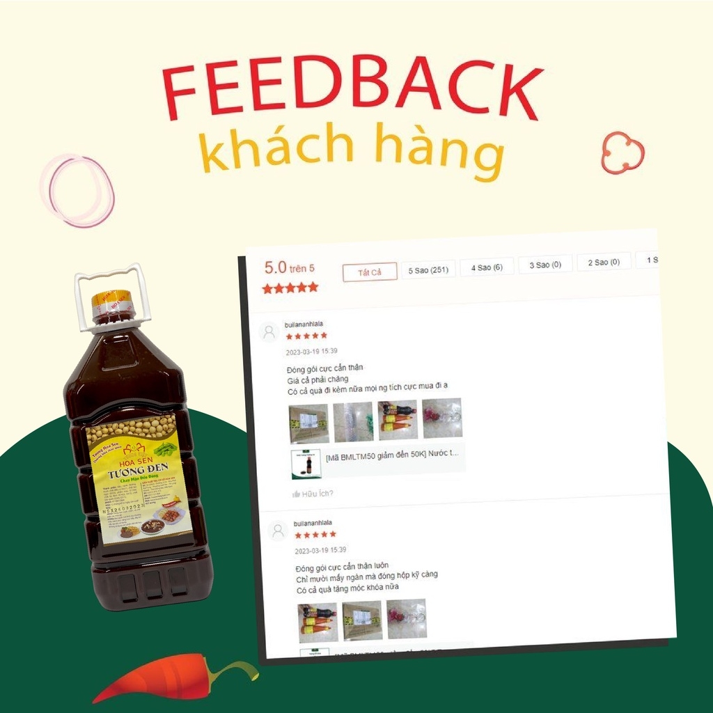 Tương Đen Bình Pet 5kg - Tương Việt Hoa Sen Trong ẩm thực của người Trung Quốc, tương đen thường được dùng cho các món như nem rán, xá xíu hay vịt quay Bắc Kinh. Còn trong ẩm thực Việt Nam, tương đen là một gia vị không thể thiếu cho món phở, gỏi cuốn hay cá viên chiên. Hãy cùng Tương Việt Hoa Sen tìm hiểu ngay về loại Tương Đen Bình Pet 4.8kg này nhé! Giới thiệu về Tương Đen Bình Pet 4.8kg: Được làm từ nguyên liệu đậu tương thơm ngon. Tương Đen Bình Pet 4.8kg của thương hiệu Tương Việt Hoa Sen có vị vừa ăn, mùi thơm hấp dẫn, góp phần tăng thêm hương vị cho các món chính như phở, bún bò… Loại tương đen còn làm gia vị khi ướp, tẩm cho các chiên, nướng gia tăng hương vị. Ưu điểm nổi bật của sản phẩm: https://cf.shopee.vn/file/sg-11134201-7rbk0-lkp0two4b1ps15 - Vị tương ngọt, đậm đà - Màu nâu đen truyền thống - Làm từ đậu nành lên men. - Tuân thủ nghiêm ngặt các tiêu chuẩn vệ sinh an toàn thực phẩm, cho bạn hoàn toàn yên tâm khi sử dụng. - Sản xuất bằng phương pháp hợp vệ sinh, an toàn. Đóng gói bằng dây chuyền tự động Thành phần: - Nguyên liệu: Đậu nành, đường, muối, gia vị … - Không phẩm màu độc hại. Hướng dẫn sử dụng Tương Đen Bình Pet 4.8kgg: - Rất ngon khi dùng trong món phở giúp tăng hương vị món ăn. - Sử dụng chấm trực tiếp với gỏi cuốn, cá viên, thịt nướng hoặc làm gia vị tẩm ướp để món ăn đậm đà, ngon miệng. Hạn sử dụng và Bảo quản: - Loại tương: Tương đen - Xuất xứ: Việt Nam - Hạn sử dụng: 12 tháng kể từ ngày sản xuất - Quy cách: Bình 4.8kg - 4 bình/thùng - Date giao hàng luôn mới nhất - Bảo quản nơi thoáng mát, sạch sẽ, tránh ánh sáng mặt trời chiếu trực tiếp. - Đóng kín sau khi dùng. Lưu ý: Sản phẩm có thể sử dụng cho người ăn chay Tương Đen Bình Pet 4.8kg là loại tương không thể thiếu trong mỗi tô phở, giúp món ăn thêm phần đậm đà, thơm ngon, trở thành gia vị quen thuộc của nhiều người và chinh phục cả những người khó tính nhất. Vậy nên, hãy bỏ túi ngay em Tương Đen Bình Pet 4.8kg của Tương Việt Hoa Sen giúp món ăn của bạn thêm phần đậm đà và trọn vị ngon hơn nhé. *Hashtag: #tuongden #tuongden #sottuongden #tuongdenanpho #nuoctuongden #tuongdenlamtugi #tuongden #sotmituongden #misottuongden #lamsottuongden #sottuongdenlamtugi #tuongdenpho #chaituongden #tuongdendaubep #tuongdenchambovien #nuocsottuongden #sottuongden #tuongdenngot #tuongdenngon #tuongviethoasen