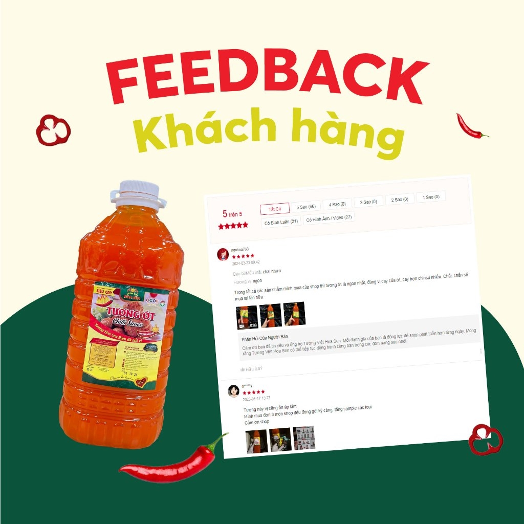 Tương Ớt Bình Pet 4.3kg - Tương Việt Hoa Sen Giới thiệu về Tương Ớt Bình Pet 4.3kg: Tương Ớt Bình Pet giúp các món ăn thêm đậm đà và mang đến cho bạn những bữa ăn ngon miệng. Tương Ớt Bình Pet 4.3kg được làm từ những nguyên liệu an toàn cho sức khỏe, bùng vị cay hít hà, kích thích vị giác. Tương ớt dùng để chấm, nêm nếm, tẩm ướt cho các món ăn. Tương ớt Bình Pet 4.3kg siêu tiết kiệm, thích hợp cho các quán ăn giúp các quán ăn có thể tính toán được số lượng tương ớt phù hợp với nhu cầu sử dụng, giảm thiểu lãng phí và tiết kiệm chi phí. Đó là lí do sản phẩm này còn hay được gọi với cái tên là Tương ớt hàng quán. Ưu điểm nổi bật của sản phẩm Tương ớt Tương Việt Hoa Sen: - Màu đỏ đến từ quả ớt, tương ớt mịn màng, mùi thơm dịu độc đáo và hương vị cay cay tê tê nồng tự nhiên cảm giác như vừa cắn quả ớt tạo vị giác ngon vô cùng hấp dẫn. - Tuyệt đối không sử dụng vị cay nhân tạo. Vị cay nhân tạo sẽ rất cay gắt, cay xộc, cay xé nhanh và tan không để lại hương vị gì. - Tuân thủ nghiêm ngặt các tiêu chuẩn vệ sinh an toàn thực phẩm, cho bạn hoàn toàn yên tâm khi sử dụng. - Sản xuất bằng phương pháp hợp vệ sinh, an toàn. Đóng gói bằng dây chuyền tự động - Tương Ớt Bình Pet 4.3kg rất tốt và hữu dụng với những người bị nhiễm lạnh, cảm cúm lạnh và tăng đề kháng. Hạt ớt được loại bỏ rất nhiều làm giảm chướng hơi và viêm dạ dày. Thành phần Tương ớt can: - Nguyên liệu an toàn: Tỏi, ớt, cà chua, muối, đường, gia vị,… - Không phụ gia hay phẩm màu độc hại. - Không có ớt hỏng vì sẽ làm cho tương dễ hỏng, mất chất, nước ớt có màu đục, nhờ nhợt đỏ hoặc màu nhợt nhạt. Hướng dẫn sử dụng Tương ớt Hoa Sen: - Dùng chấm trực tiếp hoặc tẩm ướp thức ăn, giúp tăng thêm hương vị cho món ăn, kích thích bạn ăn ngon miệng hơn. - Chấm cả thế giới với Tương Ớt Bình Pet 4.3kg, hải sản khô, mì ăn liền, phở, các món gỏi, trộn, rau củ chiên xào, thịt nướng, thịt luộc, thịt chiên rán đều rất ngon, bắt vị hoặc ăn cùng bún, phở, vị cay cay ngọt đậm đà miệng - Chấm mực nướng, hải sản hấp, hải sản tẩm bột chiên, chả giò, gà rán, khoai tây chiên, khoai tây phô mai, mì, hamburger, phở, bánh pizza,... - Đặc biệt dùng trong món ăn Mì cay, gỏi gân kiệu bò, gỏi hải sản, chấm cơm cháy....các quán ăn vặt, quán nhậu phải dùng món này. - Nấu lẩu cay, nướng cay, kho cá, kho thịt...tất cả các món cay nhé. - Dùng ăn trực tiếp hoặc nêm nếm món ăn. https://cf.shopee.vn/file/vn-11134208-7ras8-m0txhfhs8vwv40 Hạn sử dụng và Bảo quản: - Loại tương: Tương ớt - Xuất xứ: Việt Nam - Hạn sử dụng: 12 tháng kể từ ngày sản xuất - Quy cách: Bình 4.3kg - 5 bình/thùng - Date giao hàng luôn mới nhất - Bảo quản nơi thoáng mát, sạch sẽ, tránh ánh sáng mặt trời chiếu trực tiếp. - Đóng kín sau khi dùng. Lưu ý: Sản phẩm có thể sử dụng cho người ăn chay. *Hashtag: #tuongot #ottuong #tuongotcan #tuongotbinh #tuongotcanto #tuongotcan5kg #tuongot5kg #tuongotcan5lit #tuongotgiasi #tuongotgiare #tuongothangquan #tuongotquanan #tuongotcholimex #tuongotchinsu #tuongottuongviethoasen #tuongothoasen #tuongviethoasen
