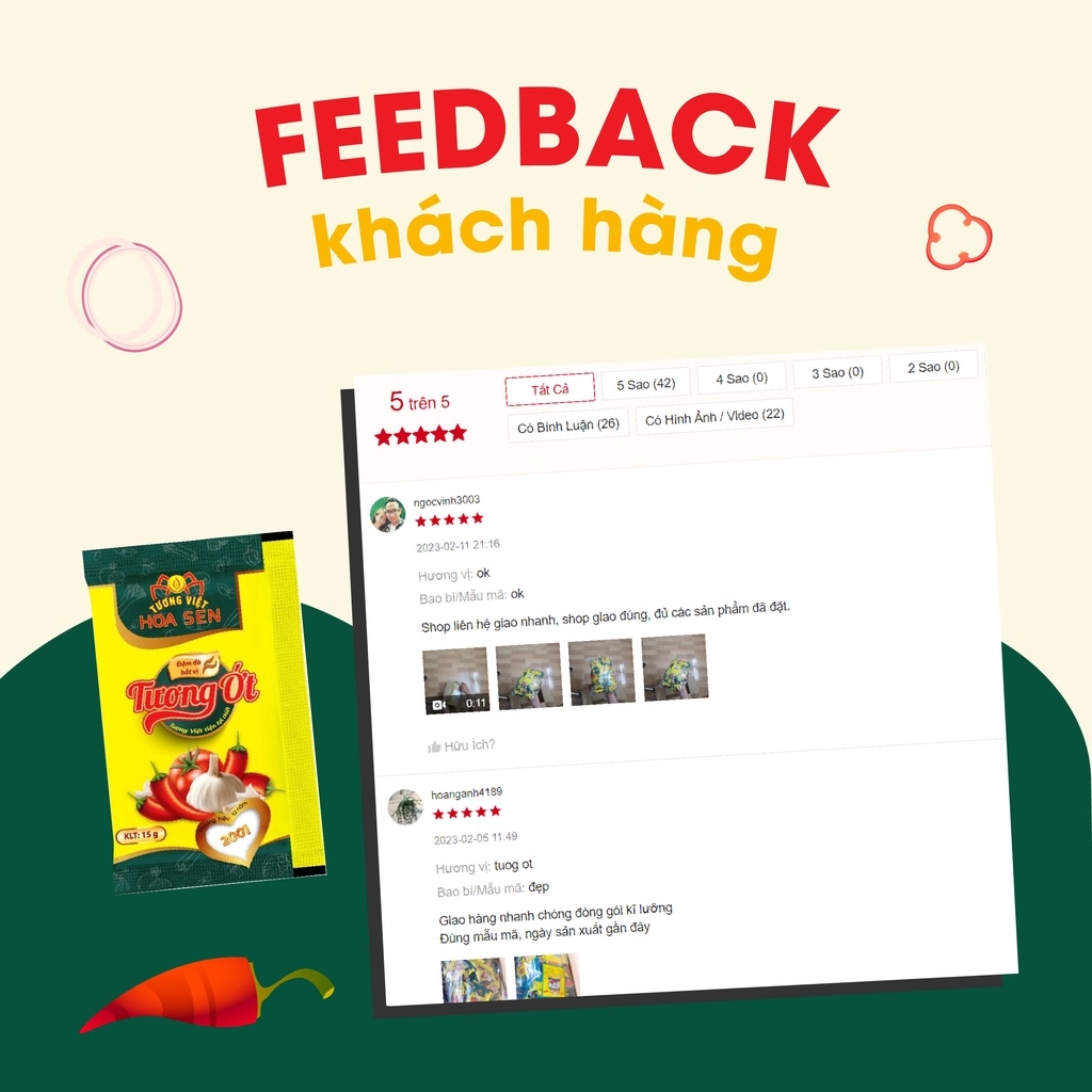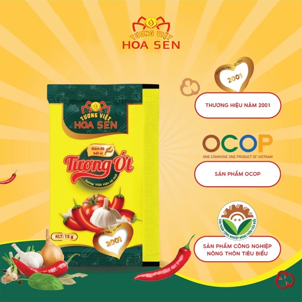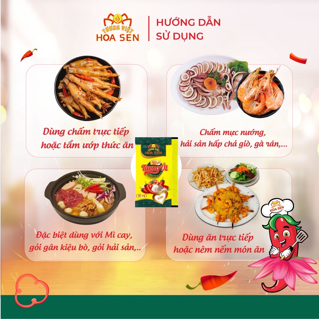 Tương Ớt Gói 15g MM - Tương Việt Hoa Sen Tương ớt là món ăn kèm hấp dẫn, điển hình là khi ăn với 1 số món nước, món ăn vặt sẽ giúp món ăn bùng vị ngon. Đối với những người yêu thích vị cay, tương ớt cay ngon là một gia vị không thể thiếu https://cf.shopee.vn/file/sg-11134201-7rblf-lm8zz2mvx2e186 Giới thiệu về Tương Ớt Gói 15g: Tương Ớt Gói 15g giúp các món ăn thêm đậm đà và mang đến cho bạn những bữa ăn ngon miệng. Sản phẩm được làm từ những nguyên liệu an toàn cho sức khỏe, bùng vị cay hít hà, kích thích vị giác. Tương Ớt Gói 15g đặc biệt thích hợp với các cửa hàng thức ăn nhanh, giúp các quán ăn có thể tính toán được số lượng tương ớt phù hợp với nhu cầu sử dụng, giảm thiểu lãng phí và tiết kiệm chi phí. Đó là lí do sản phẩm này còn hay được gọi với cái tên là Tương ớt hàng quán. Ưu điểm nổi bật của sản phẩm Tương ớt Hoa Sen: - Màu đỏ Tương ớt gói nhỏ đến từ quả ớt, tương ớt mịn màng, mùi thơm dịu độc đáo và hương vị cay cay tê tê nồng tự nhiên cảm giác như vừa cắn quả ớt tạo vị giác ngon vô cùng hấp dẫn. - Tuyệt đối không sử dụng vị cay nhân tạo. Vị cay nhân tạo sẽ rất cay gắt, cay xộc, cay xé nhanh và tan không để lại hương vị gì. - Tuân thủ nghiêm ngặt các tiêu chuẩn vệ sinh an toàn thực phẩm, cho bạn hoàn toàn yên tâm khi sử dụng. - Sản xuất bằng phương pháp hợp vệ sinh, an toàn. Đóng gói bằng dây chuyền tự động - Tương Ớt Gói 15g rất tốt và hữu dụng với những người bị nhiễm lạnh, cảm cúm lạnh và tăng đề kháng. Hạt ớt được loại bỏ rất nhiều làm giảm chướng hơi và viêm dạ dày. Thành phần: - Nguyên liệu an toàn: Ớt, đường, cà chua, tỏi, muối ăn, dấm, nước, bột bắp. - Không phẩm màu độc hại. Hướng dẫn sử dụng Tương ớt gói: - Dùng Tương ớt Hoa Sen chấm trực tiếp hoặc tẩm ướp thức ăn, giúp tăng thêm hương vị cho món ăn, kích thích bạn ăn ngon miệng hơn. - Chấm cả thế giới với Tương Ớt Gói 15g, hải sản khô, mì ăn liền, phở, các món gỏi, trộn, rau củ chiên xào, thịt nướng, thịt luộc, thịt chiên rán đều rất ngon, bắt vị, vị cay cay ngọt đậm đà miệng - Chấm mực nướng, hải sản hấp, hải sản tẩm bột chiên, chả giò, gà rán, khoai tây chiên, khoai tây phô mai, mì, hamburger, bánh pizza,... - Đặc biệt dùng trong món ăn Mì cay, chấm cơm cháy....các quán ăn vặt - Dùng ăn trực tiếp hoặc nêm nếm món ăn. https://cf.shopee.vn/file/sg-11134201-7rblk-lmfsa0ytbx6137 Hạn sử dụng và Bảo quản: - Loại tương: Tương ớt - Xuất xứ: Việt Nam - Hạn sử dụng: 12 tháng kể từ ngày sản xuất - Quy cách: Gói 15g - 100 gói/bịch - Date giao hàng luôn mới nhất - Bảo quản nơi thoáng mát, sạch sẽ, tránh ánh sáng mặt trời chiếu trực tiếp. - Đóng kín sau khi dùng. Lưu ý: Sản phẩm có thể sử dụng cho người ăn chay. Không chỉ là loại gia vị thông thường mà tương ớt còn được xem là linh hồn của nhiều món ăn. Vậy nên, hãy bỏ túi ngay em Tương Ớt Gói 15g của Tương Việt Hoa Sen giúp món ăn của bạn thêm phần đậm đà và trọn vị ngon hơn nhé. *Hashtag: #tuongot #ottuong #tuongotgoi #tuongotgoinho #tuongotgoi15g #tuongotngon #tuongothoasengoi #tuongotgiasi #tuongotgoigiasi #tuongotgiare #tuongothangquan #tuongotquanan #tuongotcholimex #tuongotchinsu #tuongottuongviethoasen #tuongothoasen #tuongviethoasen